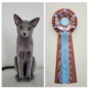 Liinun näytteura on vielä alkumetreillä, mutta se on alkanut jopa Hilppaakin huikeammin. Ihan ensimmäisenä näyttelyviikonloppunaan Liinu oli Värin paras (1×BIV) eli käytännössä rotunsa paras kissa, vaikka kilpakumppaneita oli 6. Liinu rökitti Hilpan lisäksi monta muutakin hienoa aikuistakin kissaa, vaikka on vasta 4 kk ikäinen. Huippusuoritus Liinulta!