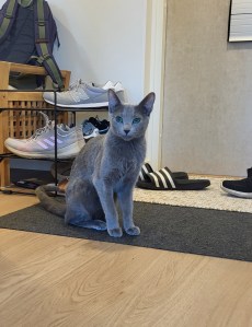 Helmi on kissalan kantaemon Minnin tytär, joka on syntynyt 11/2024. Helmi muutti toisen venäjänsinisen kaveriksi Tampereelle.